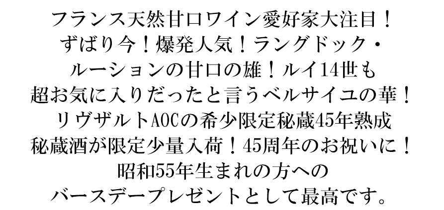 リヴザルト 1980 究極限定秘蔵熟成品 リヴェイラック元詰 AOCリヴザルト ロバート パーカー 45年周年記念用ワイン 天然甘口ワイン 甘味果実酒 商品名欄に記載されているドメーヌやシャトーの名前は、もともとその古酒を造り、貯蔵していた生産者名です(今は存在しないところも多いです)。これらの古酒は1999年から今日にかけてビン詰めされ、リヴザルト村にある定温倉庫で保管されています。彼のセレクションは、なんと「eRobertParker.com」や「JancisRobinson.com」でも紹介され、イギリス、ドイツ、オランダ、ノルウェー、スウェーデン、アメリカ、香港、シンガポール等々、世界各国で喜ばれています。』ずばり今!爆発人気!ラングドック・ルーションの甘口の雄!年々、プレゼント用として同じくらい需要が高まっている。 造り手は、ラングドック・ルーション本拠地のリヴェイラック社!!彼らにより大切に保管されてきた非常に希少な秘蔵古酒!『ルーション地方のカーヴに何十年と眠り続ける、天然甘口ワイン。多くは、大樽またはタンクに貯蔵されており、注文を受けてからビン詰めして出荷されています。しかしながら、長い歳月の間にはいろいろなことが起こります。 ダンナさんが亡くなり、古酒の山を前に途方に暮れるマダム。ワイン関係ではない仕事をしているのにドメーヌを相続して、相続税の支払いのためにも古酒を売ってしまいたいが、どこにどうやって販売したらいいのか分からない息子さんetc...。同地方の複数のワイナリーで醸造に携わっていたフィリップ・ゲラルは、ある時、「お宝を持ちながら困っている」このようなドメーヌやシャトーがたくさんあることに気づきました。そこで彼は奥さんとともにネゴシアンを設立し、このような古酒をバルクで買い取って自社ビン詰めし、世界各国へ販売する事業を開始しました。「もともと歴史が大好きで、古酒にロマンを感じていました。売り手も買い手も感謝してくれますし、この仕事にやりがいと幸福感を感じています」(ゲラル)