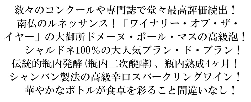 シャンパーニュ製法の高級辛口スパークリング!南仏の雄“ポール・マス”渾身の瓶内二次発酵スパークリングワイン!