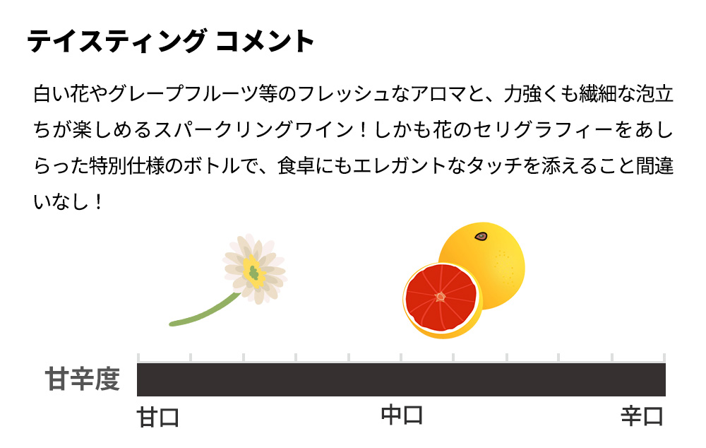 白い花やグレープフルーツ等のフレッシュなアロマと、力強くも繊細な泡立ちが楽しめるスパークリングワイン!しかも花のセリグラフィーをあしらった特別仕様のボトルで、食卓にもエレガントなタッチを添えること間違いなし!