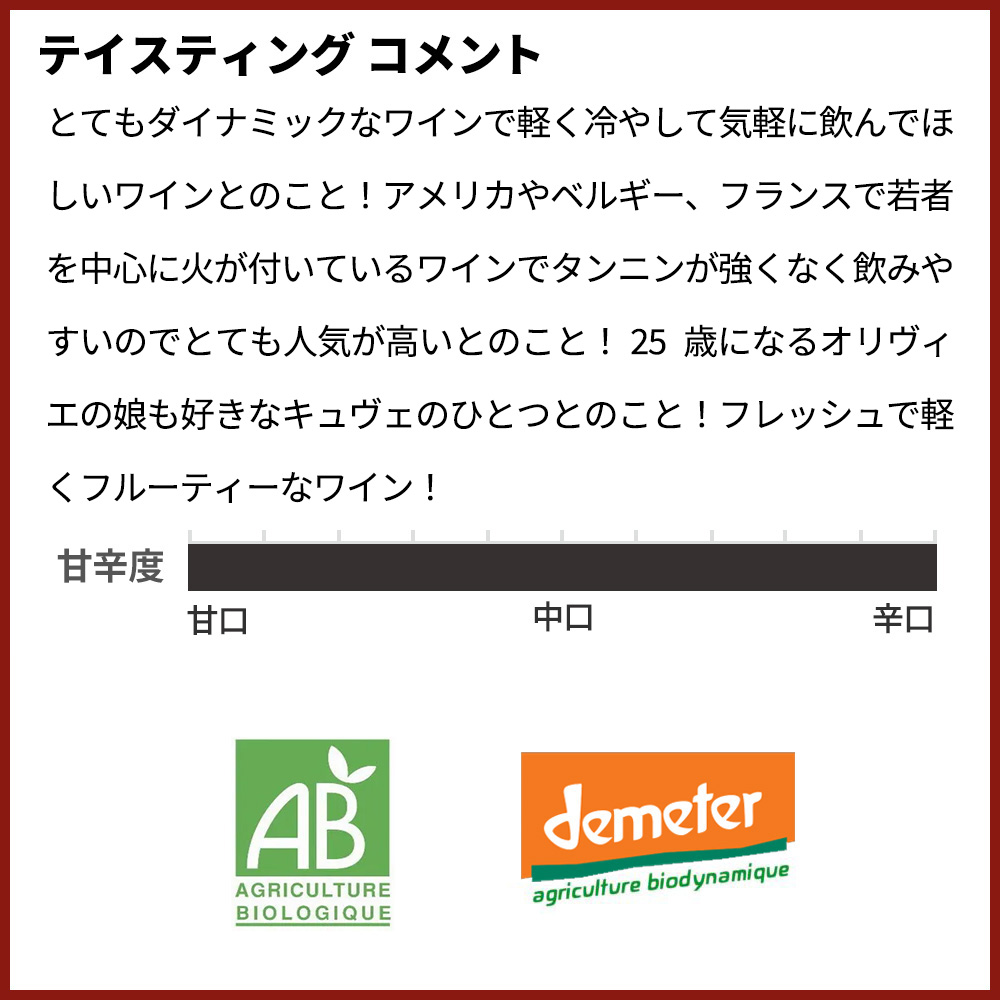 とてもダイナミックなワインで軽く冷やして気軽に飲んでほしいワインとのこと!アメリカやベルギー、フランスで若者を中心に火が付いているワインでタンニンが強くなく飲みやすいのでとても人気が高いとのこと!25歳になるオリヴィエの娘も好きなキュヴェのひとつとのこと!
