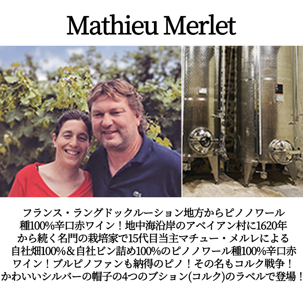 フランス・ラングドックルーション地方からピノノワール種100%辛口赤ワイン愛好家大注目!そのほとんどがフランス国内80%(残りの20%はイギリスとEU諸国のみ。)のみ(レストランとビストロ、ワインショップ)に直行!ベジエ市より北東に12km、地中海沿岸のアベイアン村に1620年から続く名門の栽培家で15代目当主マチュー・メルレによる自社畑100%&自社ビン詰め100%のピノノワール種100%辛口赤ワイン!