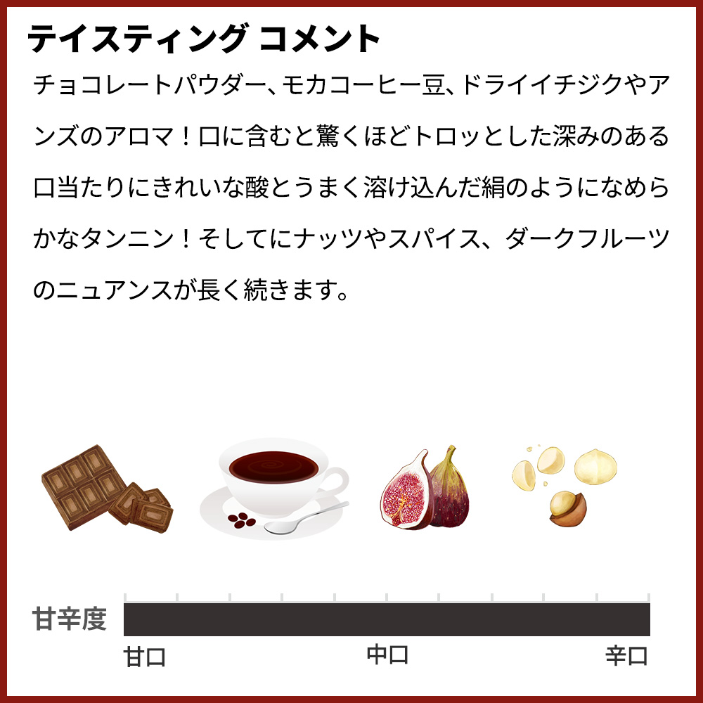 チョコレートパウダー、モカコーヒー豆、ドライイチジクやアンズのアロマ!口に含むと驚くほどトロッとした深みのある口当たりにきれいな酸とうまく溶け込んだ絹のようになめらかなタンニン!そしてにナッツやスパイス、ダークフルーツのニュアンスが長く続きます。まさにヴィンテージ・ボートの世界とも通じる優雅な味わい!