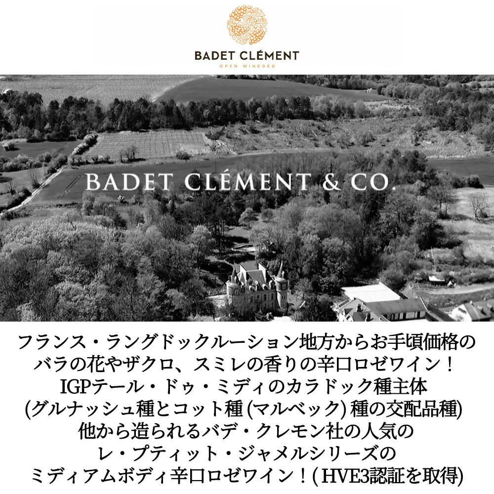 バデ・クレモン社のこのレ・プティット・ジャメルシリーズは、1995年にラングドックに設立されたBadet Clement (バデ・クレモン社) のフラッグシップであり、Les Petites Jamellesで感じる、南フランスの温かい精神の表現は親しみやすさと生きる喜び(ジョワ・ド・ヴィーヴル)にあふれ、共有する楽しさと本物らしさを表現!フレッシュでフルーティーな魅力あふれるワインは、彼らの哲学である「味わい深い出会い(Tasteful Encounters)」を見事に体現しています!