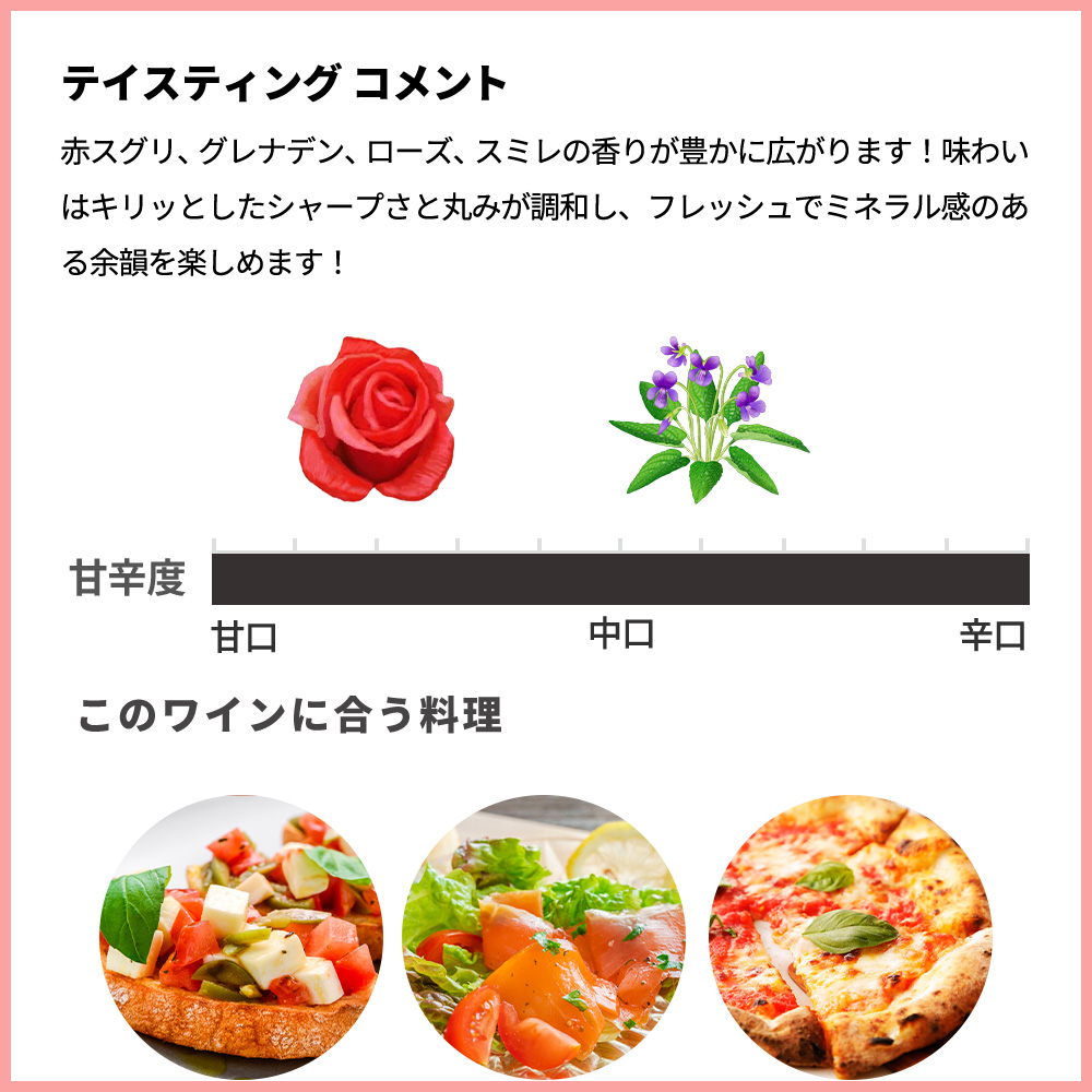 輝きのある淡いピンク色!赤スグリ、グレナデン、ローズ、スミレの香りが豊かに広がります!味わいはキリッとしたシャープさと丸みが調和し、フレッシュでミネラル感のある余韻を楽しめます!