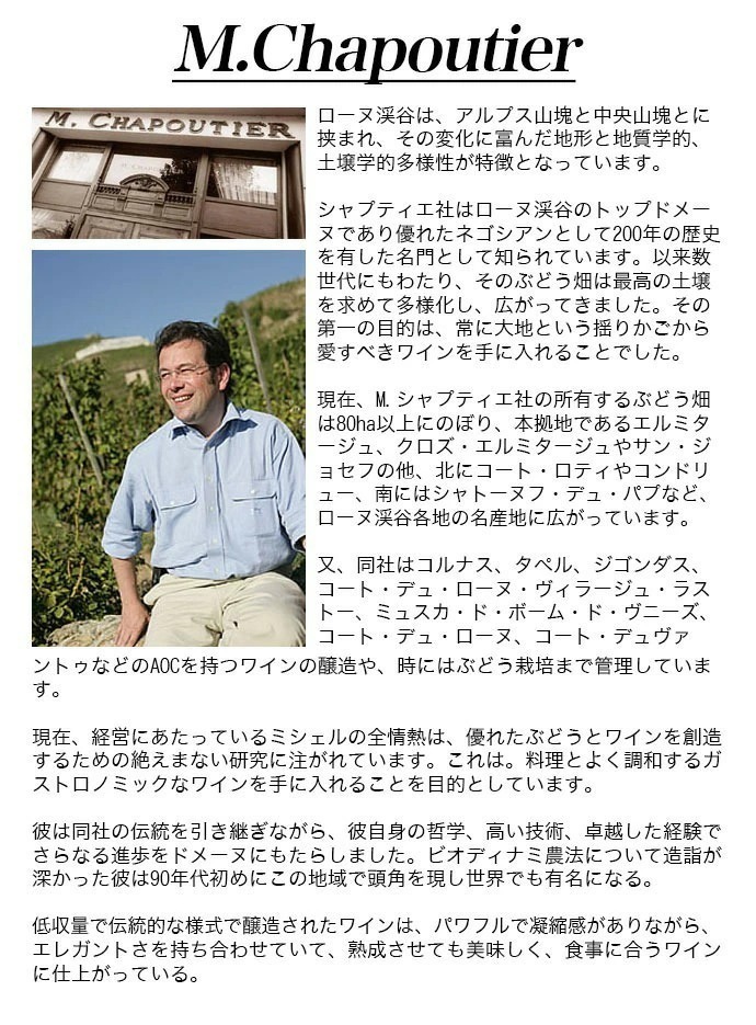 現在、M.シャプティエ社の所有するぶどう畑は80ha以上にのぼり、本拠地であるエルミタージュ、クロズ・エルミタージュやサン・ジョセフの他、北にコート・ロティやコンドリュー、南にはシャトーヌフ・デュ・パプなど、ローヌ渓谷各地の名産地に広がっています。又、同社はコルナス、タペル、ジゴンダス、コート・デュ・ローヌ・ヴィラージュ・ラストー、ミュスカ・ド・ボーム・ド・ヴニーズ、コート・デュ・ローヌ、コート・デュヴァントゥなどのAOCを持つワインの醸造や、時にはぶどう栽培まで管理しています。現在、経営にあたっているミシェルの全情熱は、優れたぶどうとワインを創造するための絶えまない研究に注がれています。これは。料理とよく調和するガストロノミックなワインを手に入れることを目的としています。
