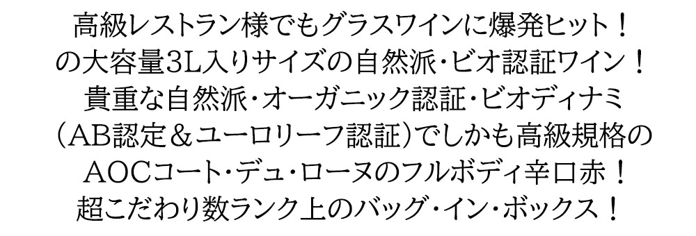コート デュ ローヌ ルージュ BIB バッグインボックス 3L 2022 ■ぶどう品種:グルナッシュ種80%&シラー20%種 ■発酵・熟成:ステンレスタンクで21日間発酵 ■土壌:粘土とシリス 高級フランス・ローヌ地方産・自然派・オーガニック農法・フルボディ辛口赤ワイン! しかも高級レストラン様でもグラスワインに爆発ヒットの3リットル入りサイズの自然派・ビオ認証のバッグインバッグ! 750mlサイズのシャトー・ド・バステ『テラム』と中身は同じワインですが、バッグインボックスにしているためビオディナミのデメテール認証は取れず、代わりにオーガニック認証のユーロリーフ認証を取得しています! ~テイスティングコメント~ 「シャトー・ド・バステ・テラム」と同じ!生産者はこのワインに「大地のように静かでどっしりとしたさま」フルボディ辛口赤をイメージしていることからこの名がつけられました! 大容量のため、750mlボトルよりもさらにまろやかさと深みが増している感があります!おすすめのお料理はビーフシチュー! 【保存方法】 要冷蔵18℃以下