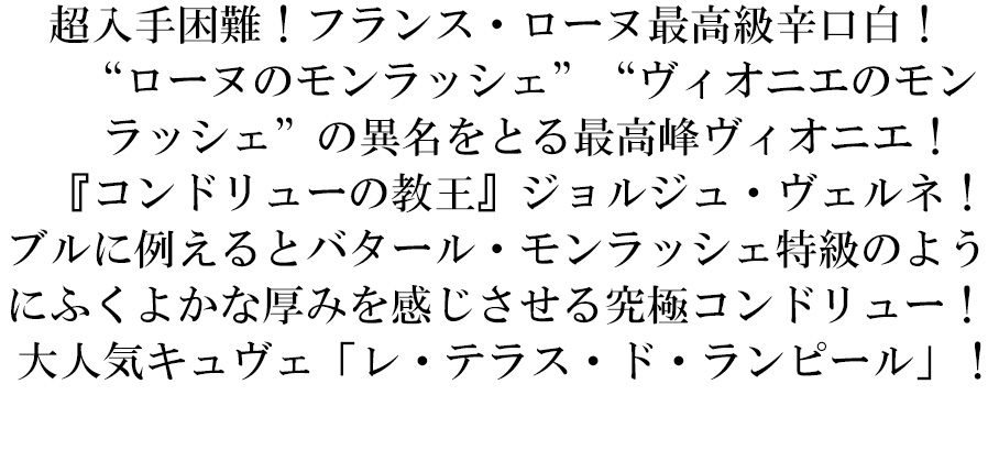 日本への入荷!極わずか!しかも『コンドリューの教王』と呼ばれるドメーヌ・ジョルジュ・ヴェルネ!フランス・ローヌ最高級辛口白ワイン愛好家垂涎!フランス最高級五大辛口白ワインの1つ!「“ローヌのモンラッシェ”“ヴィオニエのモンラッシェ”のモンラッシェ」と異名をとる最高峰のヴィオニエ!