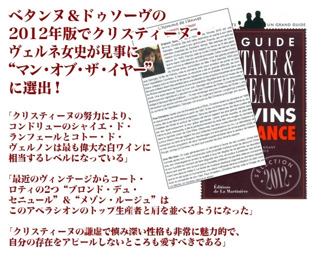 ベタンヌ&ドゥソーヴのガイド2012年版でクリスティーヌ・ヴェルネ女史が見事マン・オブ・ザ・イヤーに選ばれました。「クリスティーヌの努力によりコンドリューのシャイエ・ド・ランフェールとコトー・ド・ヴェルノンは最も偉大な白ワインに相当するレベルになっている。最近のヴィンテージからコート・ロティの二つの“ブロンド・デュ・セニュール”&“メゾン・ルージュ”はこのアペラシオンのトップ生産者と肩を並べるようになった。クリスティーヌの謙虚で慎み深い性格も非常に魅力的で、自分の存在をアピールしないところも愛すべきである」