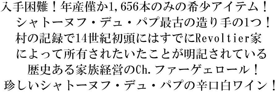 入手困難!年産僅か1,656本のみの希少アイテム!フランス高級ローヌ辛口白ワイン愛好家大注目!おいしくても価格が高いパプの固定概念を覆す、おいしくてリーズナブルな価格で提供する究極シャトーヌフ・デュ・パプで人気を博すシャトー・ファーゲェロールの珍しいシャトーヌフ・デュ・パプの辛口白ワイン!