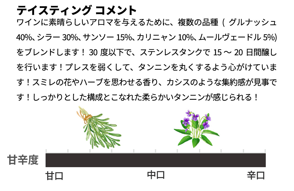 ■ぶどう品種:グルナッシュ40%、シラー30%、サンソー15%、カリニャン10%、ムールヴェードル5%