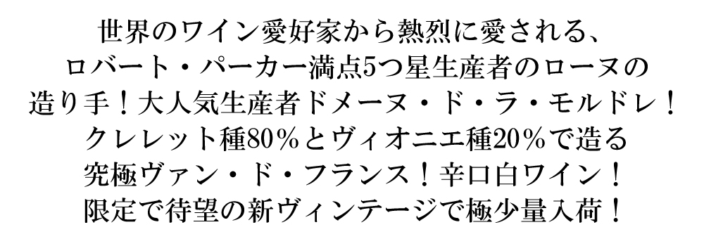 入手困難!高級ローヌ辛口白ワイン愛好家大注目!ドメーヌ・ド・ラ・モルドレ元詰愛好家垂涎!ロバート・パーカー満点5つ星生産者で、世界のワイン愛好家から渇望されるローヌの大人気生産者ドメーヌ・ド・ラ・モルドレ!