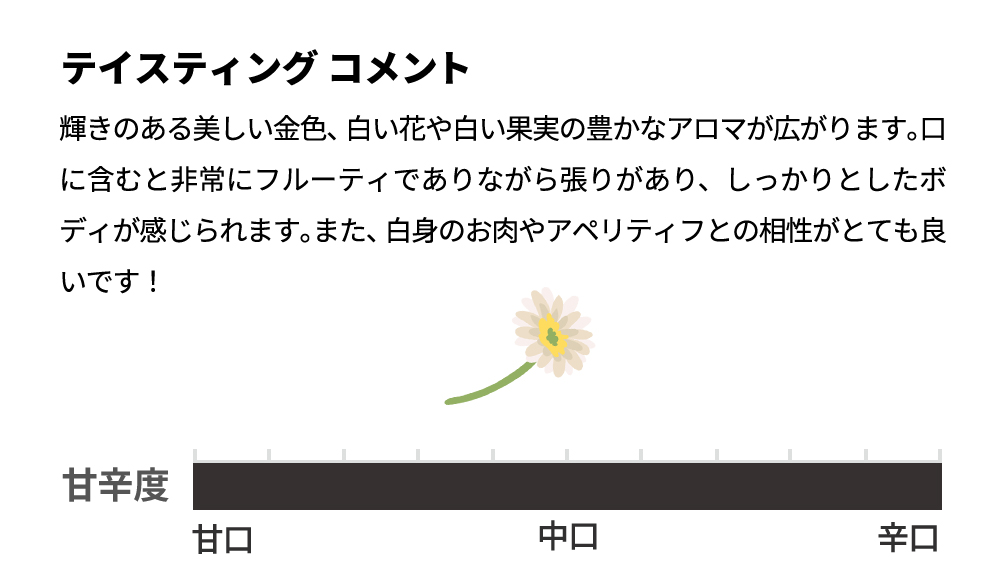 輝きのある美しい金色、白い花や白い果実の豊かなアロマが広がります。口に含むと非常にフルーティでありながら張りがあり、しっかりとしたボディが感じられます。