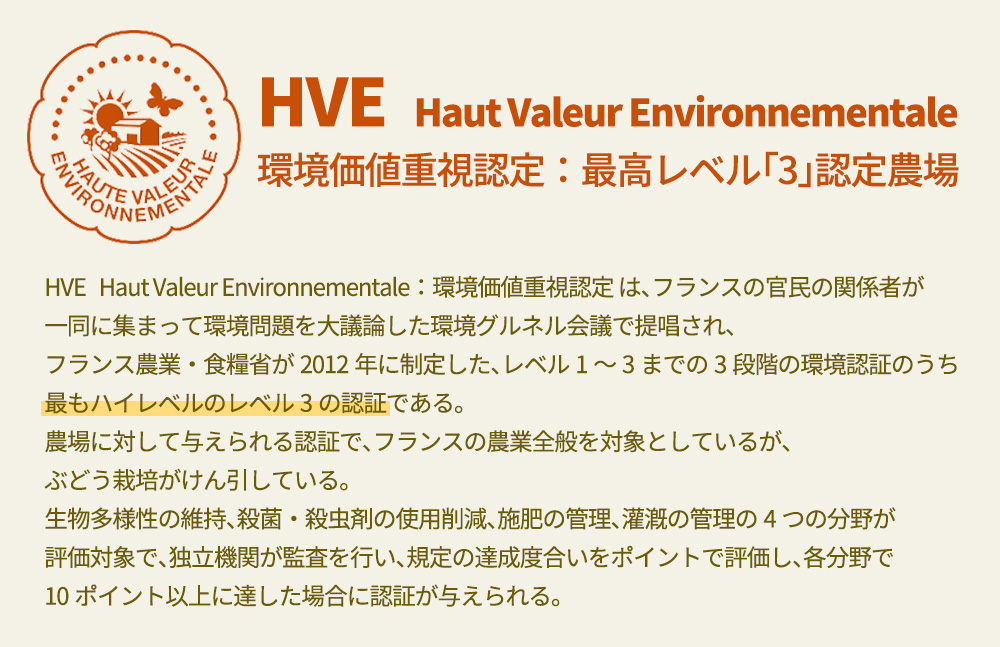HVE「Haut Valeur Environnementale:環境価値重視認定」は、フランスの官民の関係者が一同に集まって環境問題を大議論した環境グルネル会議で提唱され、フランス農業・食糧省が2012年に制定した、レベル1-3までの3段階の環境認証のうち、最もハイレベルのレベル3の認証。
