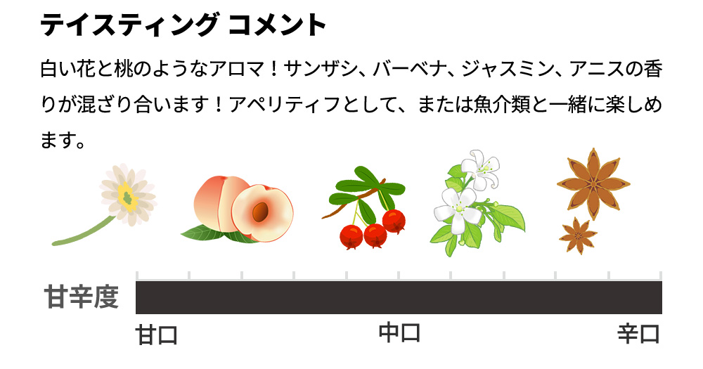 2020年に新進気鋭の生産者が始めたこのワインは、アプリコットやスミレの香りを持つ独創的なブレンドで、明るく輝く透明な麦わら色と白い花と桃のようなアロマが特徴。ジャスミンはアペリティフとしても、魚介類と一緒に楽しむのに最適な味わい豊かな辛口白ワインです。