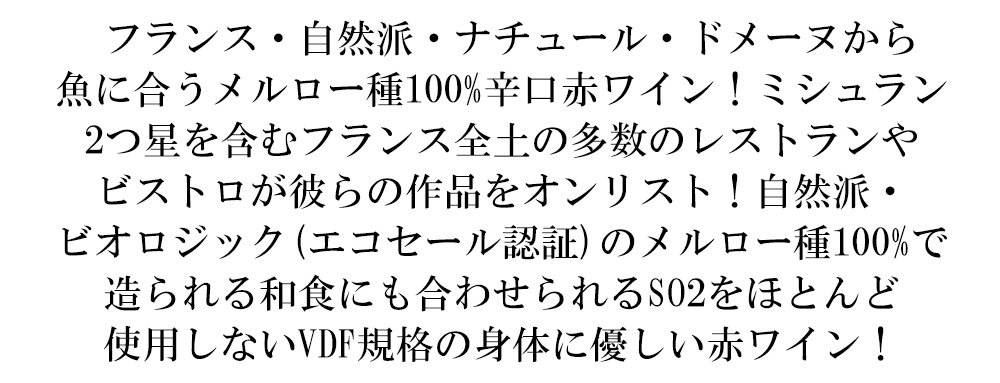 自然派・ビオロジック(エコセール認証)のメルロー種100%で造られる和食にも合わせられるSO2をほとんど使用しないVDF規格の身体に優しい赤ワイン!