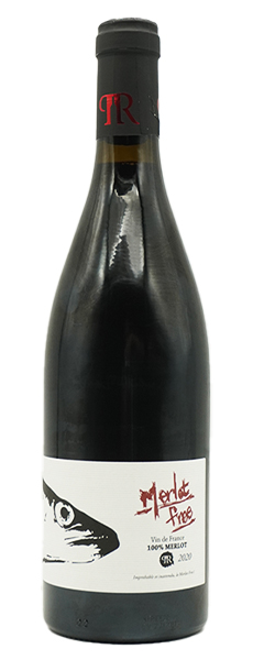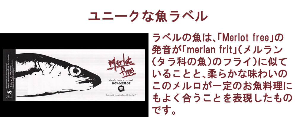 ラベルの魚は、「Merlot free」の発音が「merlan frit」(メルラン(タラ科の魚)のフライ)に似ていることと、柔らかな味わいのこのメルロが一定のお魚料理にもよく合うことを表現したものです。