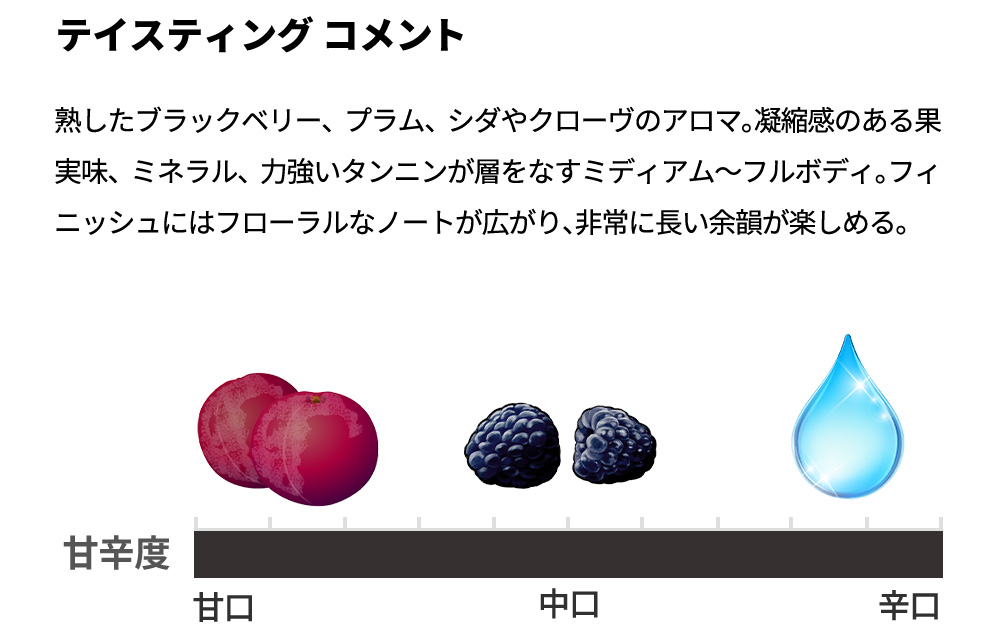 シャンポン、プロンブ、グランド・プラスの3区画のシラー種100%を使用。熟したブラックベリー、プラム、シダやクローヴのアロマ。凝縮感のある果実味、ミネラル、力強いタンニンが層をなすミディアム~フルボディ。フィニッシュにはフローラルなノートが広がり、非常に長い余韻が楽しめる。