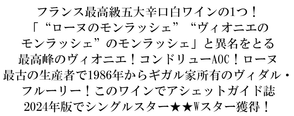 アシェットガイド誌2024年版でシングルスター★★Wスター獲得!絶賛コメントは『水仙や核果の優雅な香りとヌガティーヌのタッチの美味しさが、この非常に繊細な香りの魅力を作り上げています。酸味がアタックした後、果実のまろやかさが力強く濃縮されたほぼクリーミーな味わいを引き継ぎ、ローストアプリコットとローストヘーゼルナッツの風味を伴う長く優しい余韻へと続きます。』と大絶賛コメント!