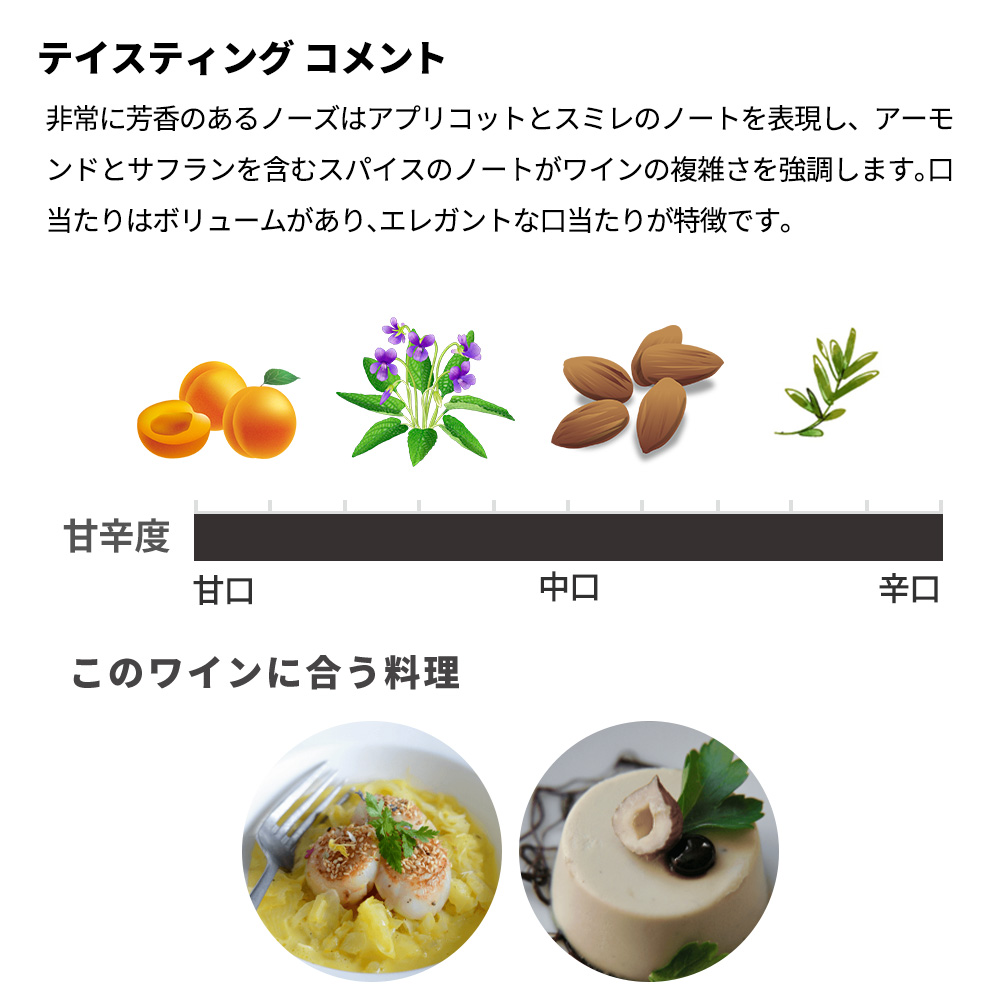 非常に芳香のあるノーズはアプリコットとスミレのノートを表現し、アーモンドとサフランを含むスパイスのノートがワインの複雑さを強調します。口当たりはボリュームがあり、エレガントな口当たりが特徴です。酸味、コク、香りの力強さのバランスが、このワインに稀有なフィネスを与えています。