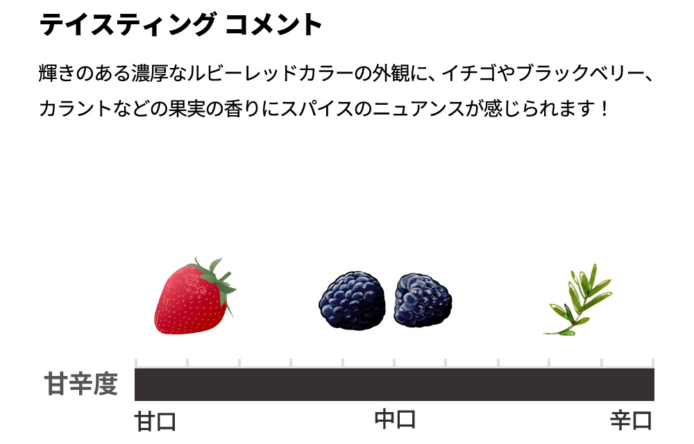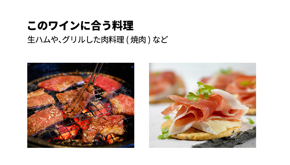 輝きのある濃厚なルビーレッドカラーの外観に、イチゴやブラックベリー、カラントなどの果実の香りにスパイスのニュアンスが感じられます!しっかりとした果実味にスパイシーなアロマが調和したまろやかな味わいが特徴的!生ハムや、グリルした肉料理(焼肉)などと良く合います!