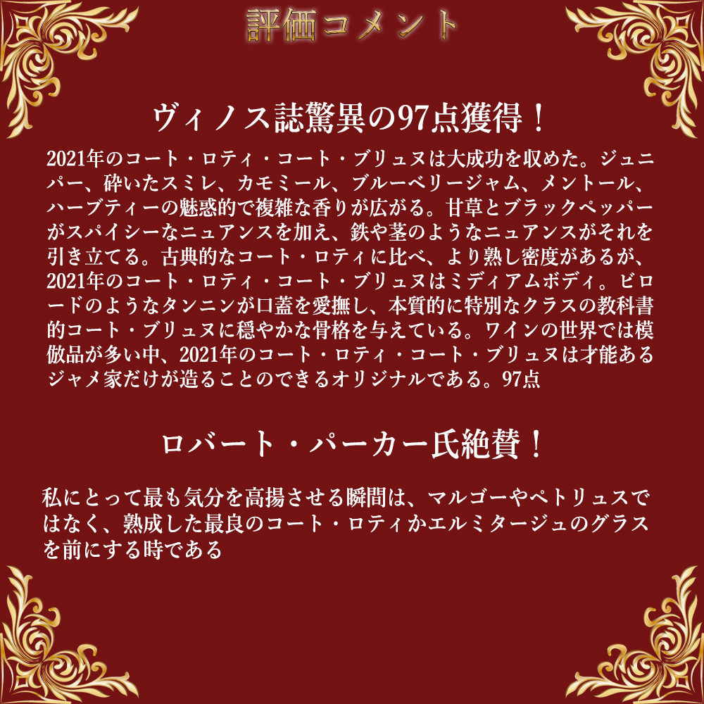 ロバート・パーカー氏「私にとって最も気分を高揚させる瞬間は、マルゴーやペトリュスではなく、熟成した最良のコート・ロティかエルミタージュのグラスを前にする時である」と絶賛!