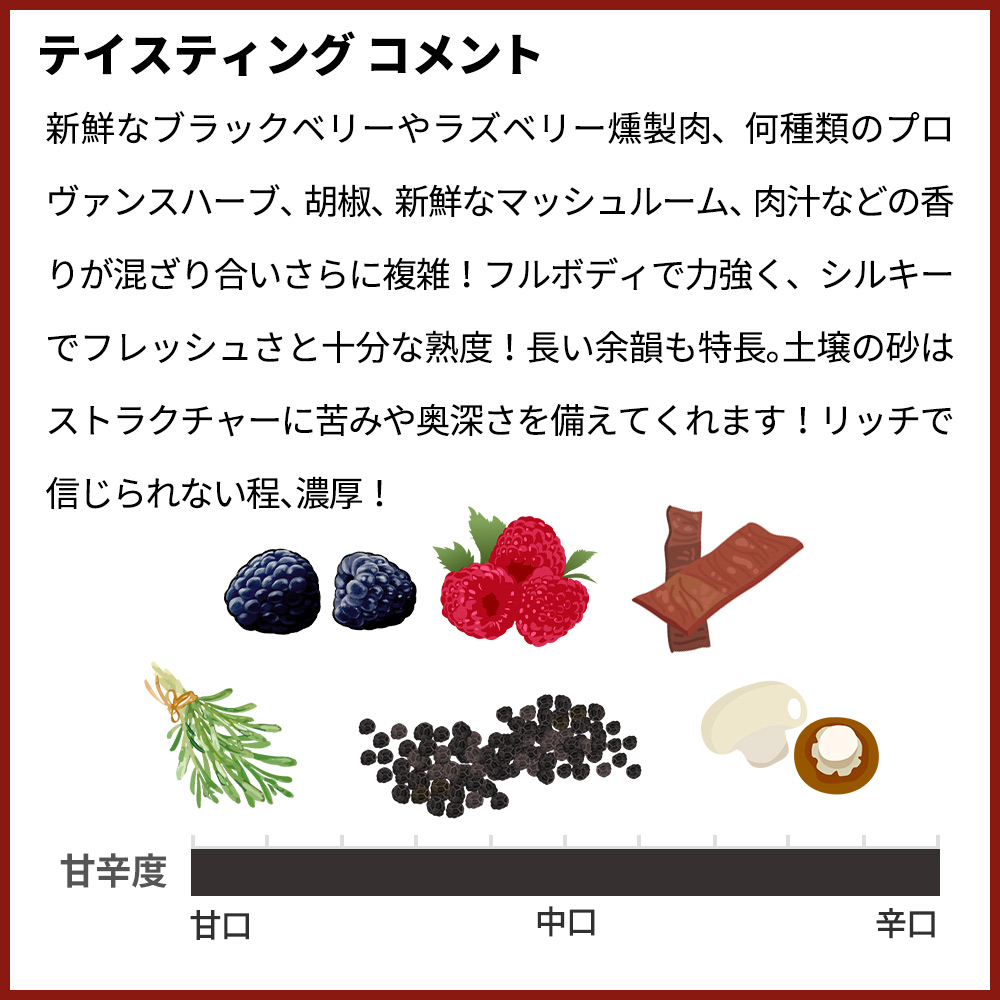 ジェームス・サックリング高評価でコメントは「スパイスとドライフルーツの風味が豊かで、フルーツケーキを思わせる香りと味わいが感じられる。しかしアルコールによる重さや温かみがなく、しっかりとしたドライ感があるため、熟しすぎた印象は一切ない。豊かな風味と温かみのある適度なタンニンのバランスが絶妙で、満足感をもたらす。長く調和の取れた余韻が続く。」!