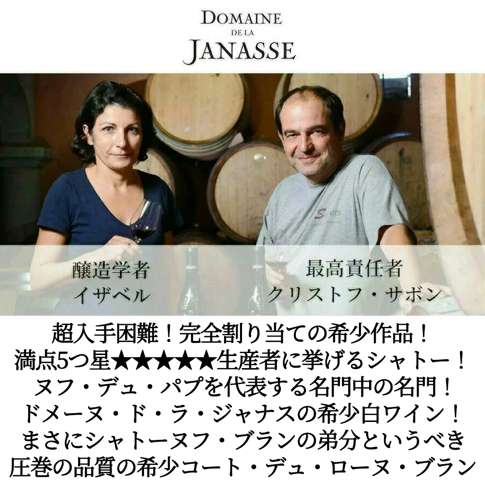 銘醸ジャナスの希少コート・デュ・ローヌ・ブランが限定で少量入荷!14世紀、アヴィニョンにおかれた法王庁が、この地を夏の居住地に選んだことからシャトーヌフ・デュ・パプ(法王の新しい館)という村名になったという、赤ワインの産地としても有名ですが、少量生産ながら、良質のこの辛口白ワインも大人気!