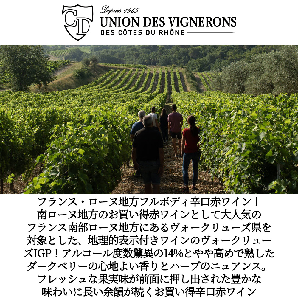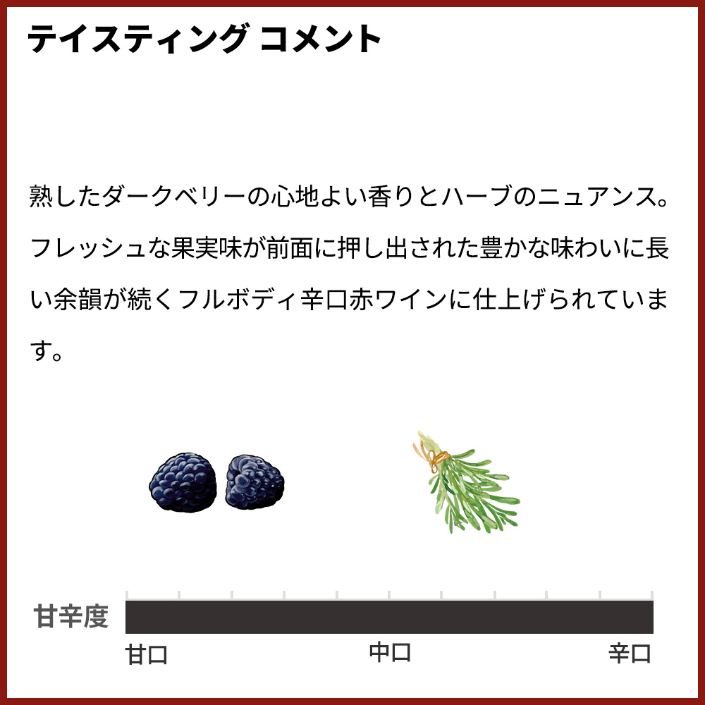 ワインはアルコール度数驚異の14%とやや高めで熟したダークベリーの心地よい香りとハーブのニュアンス。フレッシュな果実味が前面に押し出された豊かな味わいに長い余韻が続くフルボディ辛口赤ワインに仕上げられています。(輝きのあるルビーカラーの外観に、熟したダークベリーの心地よい香りとハーブのニュアンスが感じられます。フレッシュな果実味豊かな優雅な味わいに長い余韻が続きます。ソーセージやハムステーキなどと良く合います。)