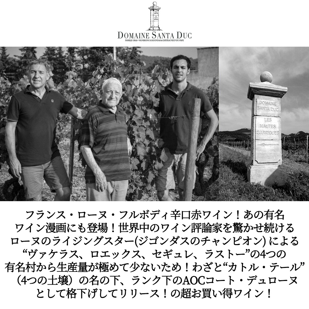 世界中のワイン評論家を驚かせ続けるローヌのライジングスター!ドメーヌ・サンタ・デュックが4つのコート・デュ・ローヌ・ヴィラージュの有名村から、あえてランク下のAOCコート・デュローヌとしてリリース!