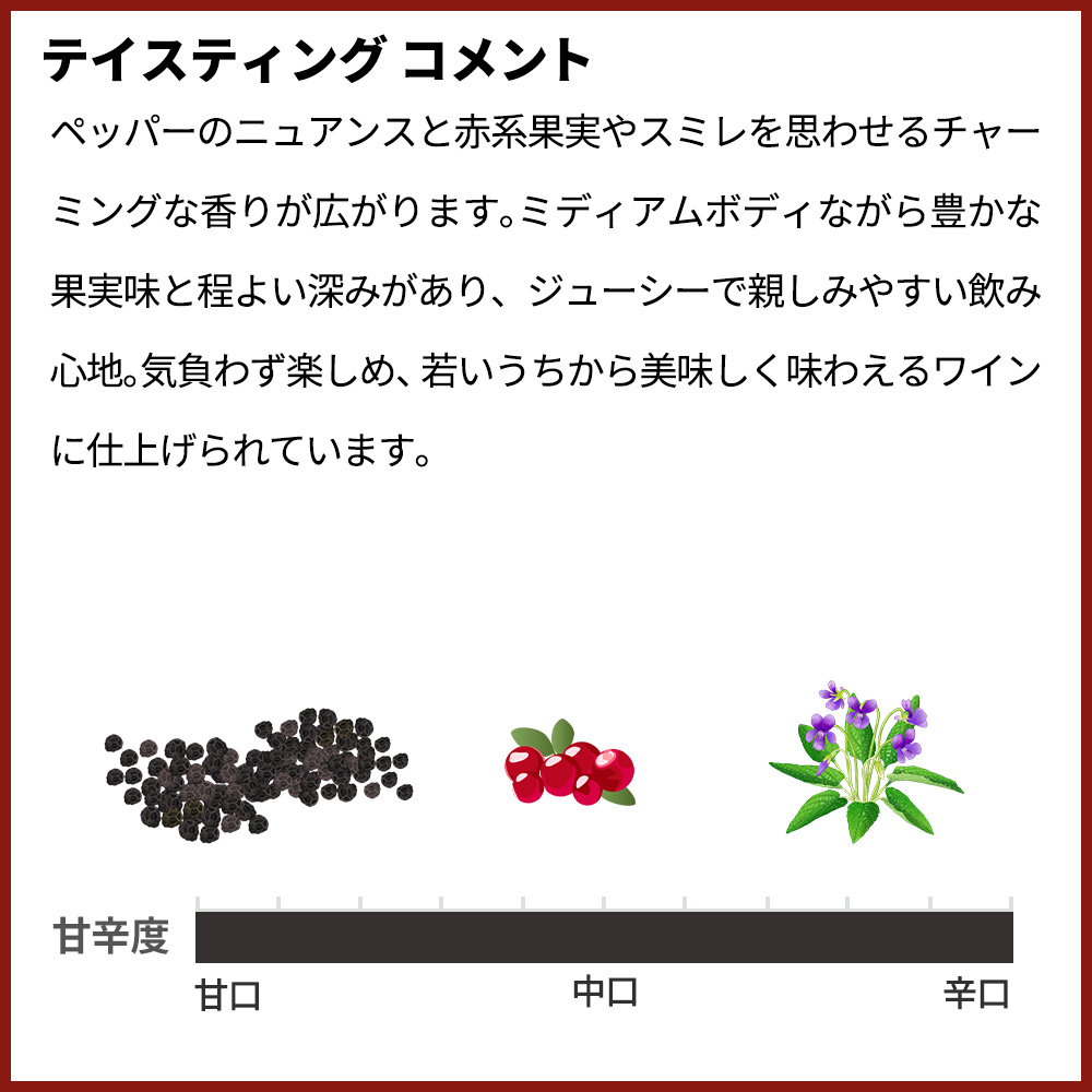 ルビー色の外観で、ペッパーのニュアンスと赤系果実やスミレを思わせるチャーミングな香りが広がります。ミディアムボディながら豊かな果実味と程よい深みがあり、ジューシーで親しみやすい飲み心地。気負わず楽しめ、若いうちから美味しく味わえるワインに仕上げられています。