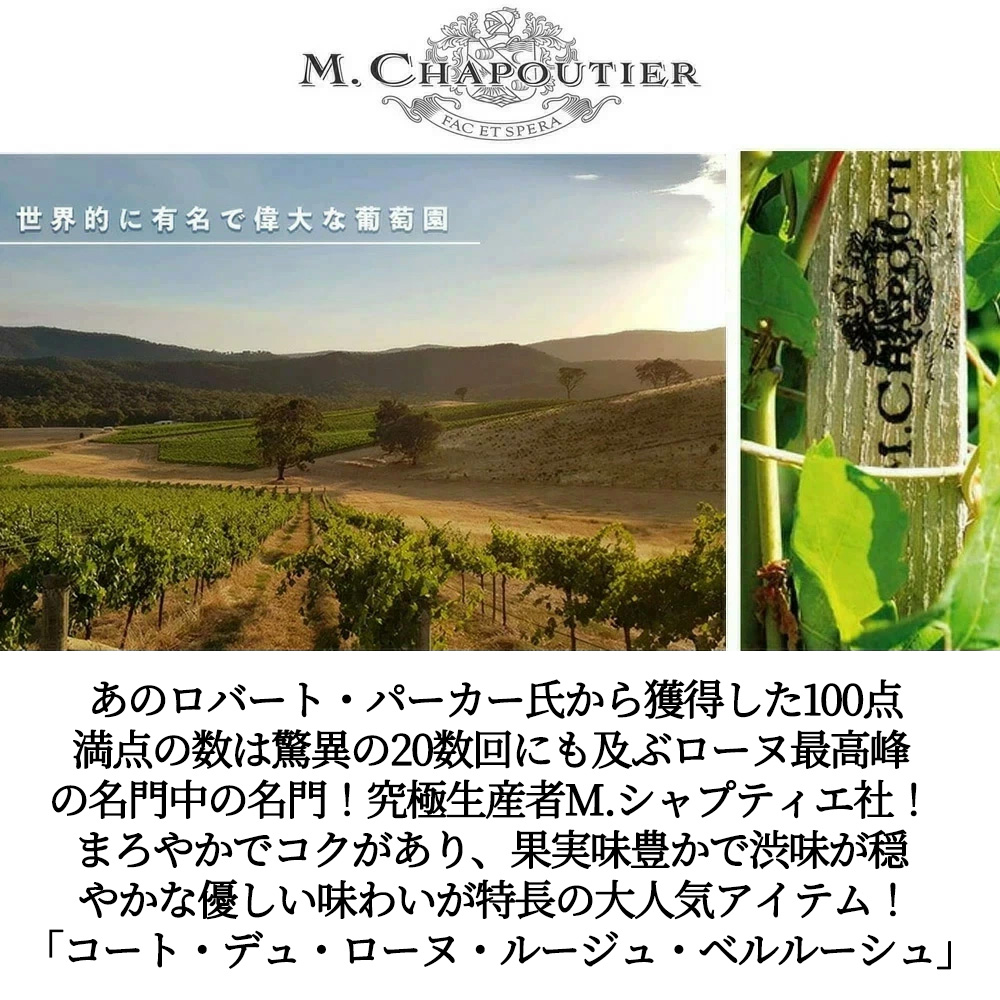 あのロバート・パーカーから獲得した100点満点の数は驚異の20数回にも及ぶローヌ最高峰の究極生産者、M.シャプティエが手がけた、「リーズナブルで品質の良いワインを造る」をコンセプトに造られたコート・デュ・ローヌ・ルージュ・ベルルーシュ!
