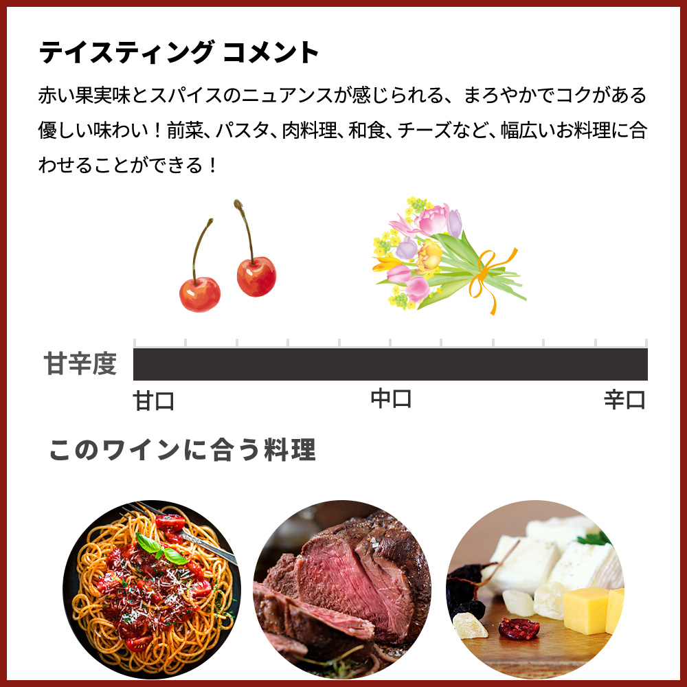 グルナッシュとシラーをブレンドした、赤い果実の風味がたっぷりの、程よいボディを持った飲みやすい赤ワイン!シラーはベルルーシュに良い骨格を与え、グルナッシュは丸みと繊細さ、花の香りを与えます!赤い果実味とスパイスのニュアンスが感じられる、まろやかでコクがある優しい味わい!前菜、パスタ、肉料理、和食、チーズなど、幅広いお料理に合わせることができる究極コート・デュ・ローヌ・ルージュ・ベルルーシュの大人気ヴィンテージ[2024]年が限定で少量入荷!