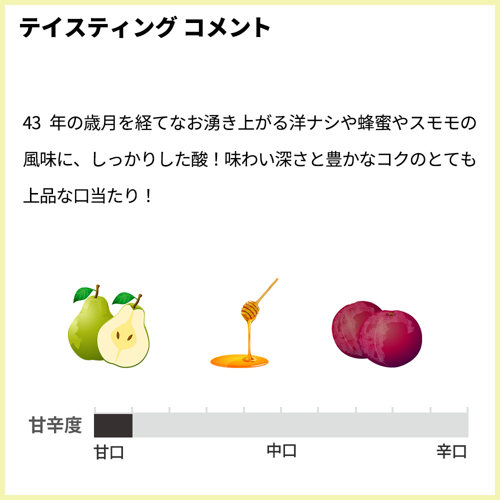 ビロードのようななめらかな甘口白ワインで、43年の歳月を経てなお湧き上がる洋ナシや蜂蜜やスモモの風味に、しっかりした酸!味わい深さと豊かなコクのとても上品な口当たり!(長い熟成によってもたらされた蜜のような甘味!)が最高の飲み頃人気甘口白ワインが蔵出しで限定少量入荷!1983年生まれ(昭和58年生まれ)の方へのバースデープレゼントに最適です!
