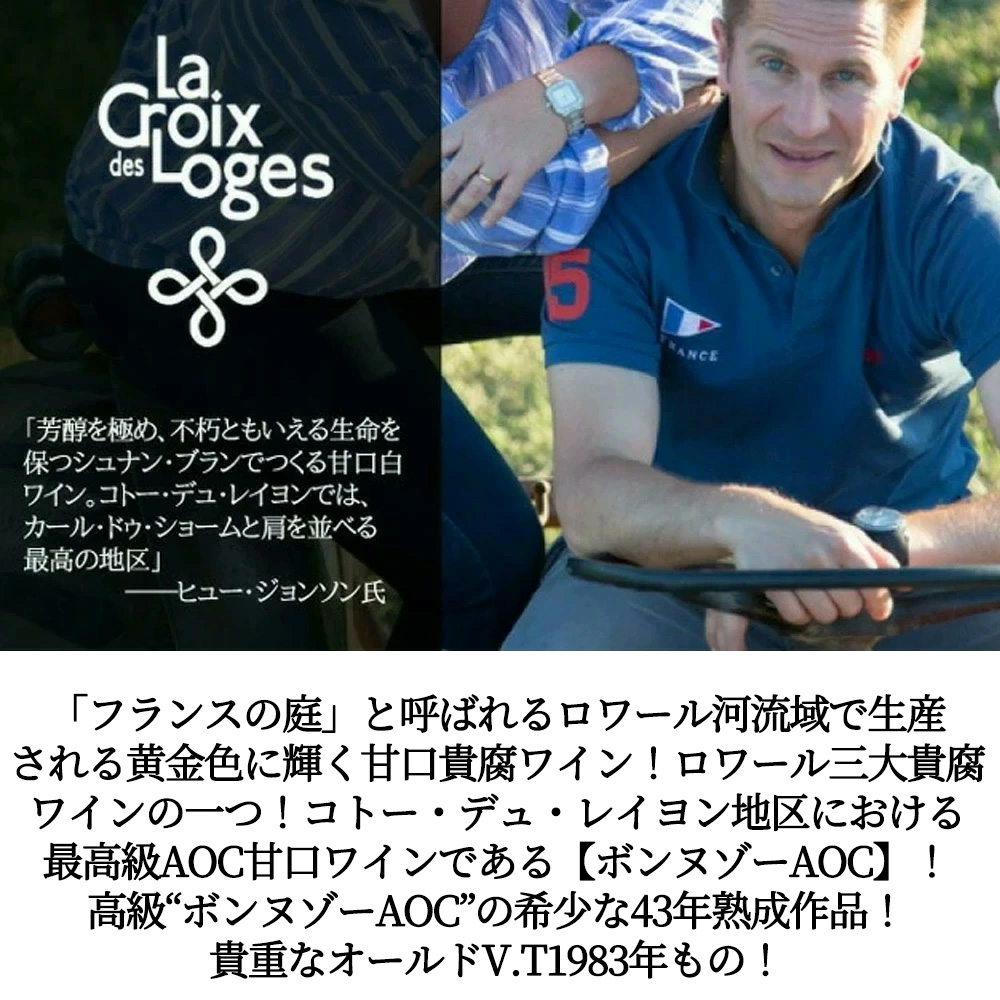 ワイン評論家のヒュー・ジョンソン氏に「芳醇を極め、不朽ともいえる生命を保つシュナン・ブランでつくる甘口白ワイン。コトー・デュ・レイヨンでは、カール・ドゥ・ショームと肩を並べる最高の地区」と★★★-★★★★4つ星獲得!と絶賛させたAOCボンヌゾー!しかもびっくり!貴重なオールドヴィンテージ!43年熟成バックヴィンテージ!