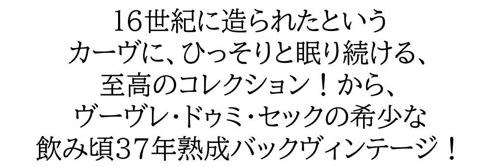 ヴーヴレ ドゥミ セック 1985 究極秘蔵限定古酒 カーヴ アンバシア社 ダニエル ガテ家 至高の古酒コレクション AOCヴーヴレ ドゥミ セック ■ぶどう品種:シュナン・ブラン種100% ■平均樹齢:30年 ■収穫:手摘み100% ■土壌:シレックス、粘土石灰質土壌 クリスティーズのオークショナーでMWのマイケル・ブロードベント氏も★★★★4つ星をつけ、「ヴーヴレは甘味と酸とのバランスが完璧で、素晴しい能力をもっている」と絶賛!のグレイトヴィンテージ[1985]年もの! しかもワイン評論家のヒュー・ジョンソン氏が「トゥールの東にある重要なAOC!次第に良質で信頼のおけるものとなっている。半辛口のdemi-secが典型的なスタイル」と★★~★★★★4つ星で大注目! 37年を迎え、円熟した果実味!アンズやアーモンド、ハーブの香り!熟成感とミネラル感にシュナンブラン種の完熟した甘味と酸のバランス!の究極ヴーヴレ・ドゥミ・セックの希少古酒が現地のセラー蔵出しで限定少量入荷! 37周年のお祝いに!昭和60年生まれの方へのプレゼントにも最適です。