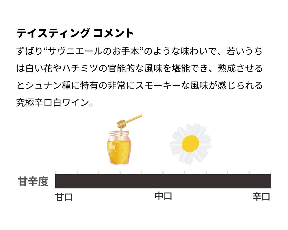 9.5haのシスト(片岩)、火山岩土壌の樹齢約50年のヴィエイユ・ヴィーニュのシュナン・ブラン種100%をステンレスタンクで7ヶ月熟成で造る究極サヴニエール。ずばり“サヴニエールのお手本”のような味わいで、若いうちは白い花やハチミツの官能的な風味を堪能でき、熟成させるとシュナン種に特有の非常にスモーキーな風味が感じられる究極辛口白ワイン。