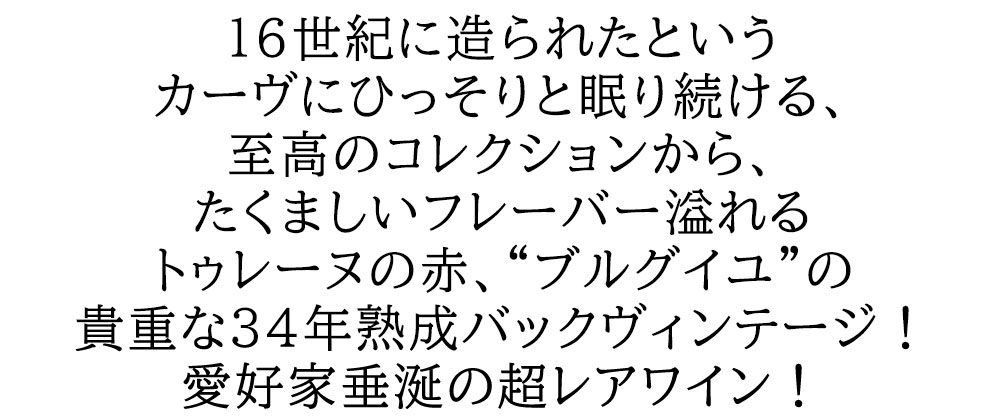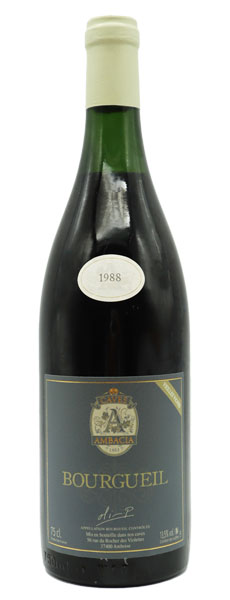 ブルグイユ 1988 究極限定秘蔵古酒 カーヴ アンバシア社 ダニエル ガテ家 AOCブルグイユ ■ぶどう品種:カベルネ・フラン100% ■平均樹齢:15~50年 ■土壌:テュフォー/粘土石灰質/砂質土壌 超レア!オールドヴィンテージファン垂涎!ロワールではブルグイユ年と言われる大人気★★★★4つ星年の[1988]年! しかもシノンAOCの対岸!「カベルネ・フラン種をベースにたくましいフレーバー溢れるトゥレーヌ地方で最古の赤!!優良な収獲年のワインはゆうに15年以上の熟成が可能」と絶賛し★★~★★★(★)3.5星で大注目!の人気ロワール辛口赤ワインのブルグイユAOC! つぶしたフランボワーズのアロマ!口当たりの良いタンニンと口の中で長く続くアロマ!の飲み頃!希少な究極ブルグイユが限定で極少量入荷! 34周年記念のお祝いに!昭和63年生まれの方へのバースデープレゼントに最適です!
