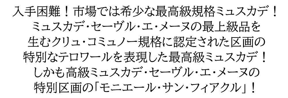 ミュスカデ セーヴル エ メーヌ モニエール サン フィアクル 2015 ドメーヌ レ ベット キュリウーズ元詰 AOCミュスカデ ■発酵・熟成:コンクリートタンク ■平均樹齢:50年 ■土壌:片麻岩 入手困難な9年熟成のクリュ・コミュノー規格の究極ミュスカデ・セーヴル・エ・メーヌ・モニエール・サン・フィアクル! ロワール地方のキレあり辛口白ワインの代名詞!ロワールのワインは“パリジャン”のワインと呼ばれます!華麗な古城が点在する風光明媚なロワール川の流域にあるナント市から、フレッシュ&クリスピーな爽やかさが特徴のフランスを代表するすっきり辛口白ワイン! しかもミュスカデ・セーヴル・エ・メーヌの最上級品を生むクリュ・コミュノーに認定された区画の特別なテロワールを表現した最高級ミュスカデ・セーヴル・エ・メーヌ・モニエール・サン・フィアクル! 発酵は天然酵母で約3週間から4週間行います!マロラクティック発酵はしません!熟成期間中のバトナージュも行いません!ヴィンテージによって異なりますが、通常4~5年、澱と共に長期間の熟成(シュール・リー)を行います!非常に複雑でミネラルが豊か、クリーンで明確かつ少し塩っぽさを感じるのが特徴! 最高級ミュスカデ・セーヴル・エ・メーヌ・モニエール・サン・フィアクルが現地のセラー数ヶ月前の蔵出し品の正規品で限定少量入荷!
