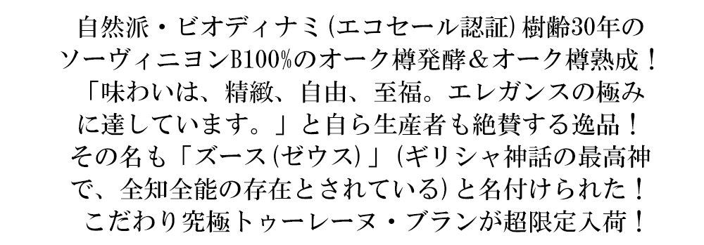 「ズース(ゼウス)」はギリシャ神話の最高神で、全知全能の存在とされています!こだわり究極トゥーレーヌ・ブランが限定で少量入荷!
