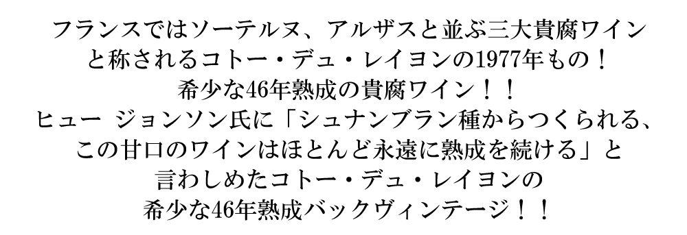 46年熟成コトー・デュ・レイヨン・オールドが限定少量入荷!甘口ファンの方!貴腐ワインファンの方はぜひ!押さえてください!46周年のお祝に!1977年(昭和52年)生まれ方へのプレゼントにも最適です。