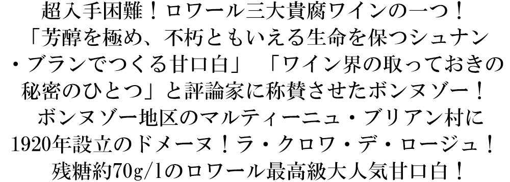 このワインは、ロワール地方の名高い甘口白ワイン、ボンヌゾーAOCの逸品である。シュナン・ブラン100%で造られ、平均樹齢50年の古樹から収穫されたブドウを使用している。シスト土壌で育てられたブドウは、ステンレスタンクでアルコール発酵後、400リットルの樽で12ヶ月間シュール・リー熟成される。残糖約70g/lのリコルーワインで、豊かな甘みと酸のバランスが特徴だ。生産者のジャン・クリスチャン・ボナンは、厳格なリュット・レゾネ栽培を実践し、「テラ・ヴィティス」や「HVE level3」の認証を取得している。このワインは、ワイン評論家のヒュー・ジョンソン氏やロバート・パーカー氏から高い評価を受けており、「芳醇を極め、不朽ともいえる生命を保つ」と称賛されている。フランス国内の多くのレストランで支持されるこのワインは、糖と酸のバランスが絶妙で、長期熟成能力も高い。ロワールを代表する最高級甘口白ワインとして、デザートワイン愛好家から大きな注目を集めている逸品だ。