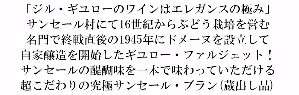 ロワール地方のミネラルたっぷりのビオのソーヴィニヨン・ブラン種100%辛口白ワインファン大注目!「ジル・ギユローのワインは、エレガンスの極みである」とベタンヌ&ドゥソーヴに言わしめた究極白ワイン!
