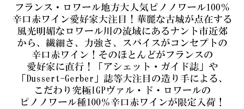 華麗な古城が点在する風光明媚なロワール川の流域にあるナント市近郊から、繊細さ、力強さ、スパイスがコンセプトの辛口赤ワイン!こだわり究極IGPヴァル・ド・ロワールのピノノワール種100%辛口赤ワインが限定入荷!