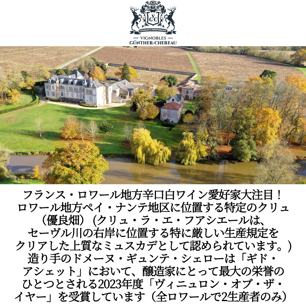 ムロン・ド・ブルゴーニュ(ミュスカデ)100%の辛口白ワイン!造り手のドメーヌ・ギュンテ・シェローはサン・フィアクル・シュル・メーヌ村に16世紀から続く名門のぶどう栽培家で、フランスのワインガイド「ギド・アシェット」において、醸造家にとって最大の栄誉のひとつとされる2023年度「ヴィニュロン・オブ・ザ・イヤー」を受賞しています(全ロワールで2生産者のみ)。豊かな果実味とミネラルに溢れ、繊細を極めたそのワインの品質はナント地区を代表するものであり、「ギド・アシェット」に限らず多数のワインメディアが毎年惜しみない激賞を贈っています。