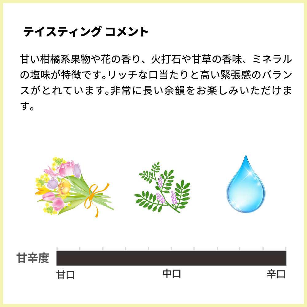 「このクリュのワインは、甘い柑橘系果物や花の香り、火打石や甘草の香味、ミネラルの塩味が特徴です。リッチな口当たりと高い緊張感のバランスがとれています。非常に長い余韻をお楽しみいただけます」(ヴェロニク)。もちろん現地のセラー数ヶ月前の蔵出し作品で正規品の素晴らしい状態で限定少量入荷!