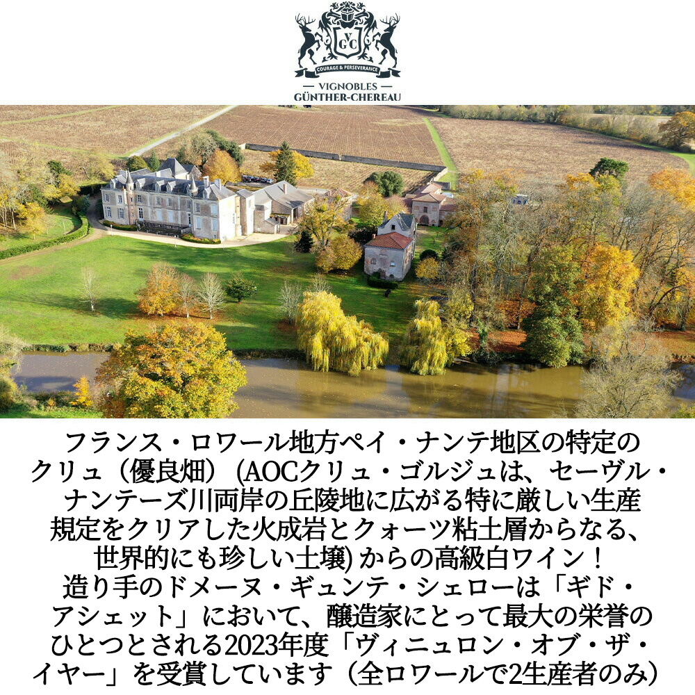 造り手のドメーヌ・ギュンテ・シェローはフランスのワインガイド「ギド・アシェット」において、醸造家にとって最大の栄誉のひとつとされる2023年度「ヴィニュロン・オブ・ザ・イヤー」を受賞しています(全ロワールで2生産者のみ)。豊かな果実味とミネラルに溢れ、繊細を極めたそのワインの品質はナント地区を代表するものであり、「ギド・アシェット」に限らず多数のワインメディアが毎年惜しみない激賞を贈っています。