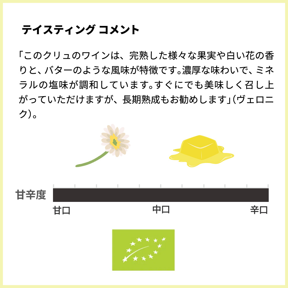「このクリュのワインは、完熟した様々な果実や白い花の香りと、バターのような風味が特徴です。濃厚な味わいで、ミネラルの塩味が調和しています。すぐにでも美味しく召し上がっていただけますが、長期熟成もお勧めします」(ヴェロニク)。