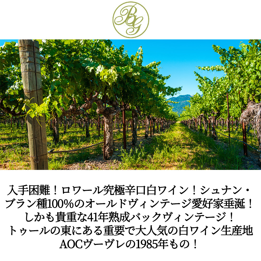 41年を経て、白桃やミラベル(黄桃)、アーモンド、ローズマリーなどの甘い香りに、ミネラルとシュナン・ブランの完熟した甘味にきれいな酸!の究極ヴーヴレ・セックAOCの貴重な41年熟成ものの偉大な1985年ものが限定で、しかも現地のセラー数ヶ月前の蔵出し作品で限定少量入荷!