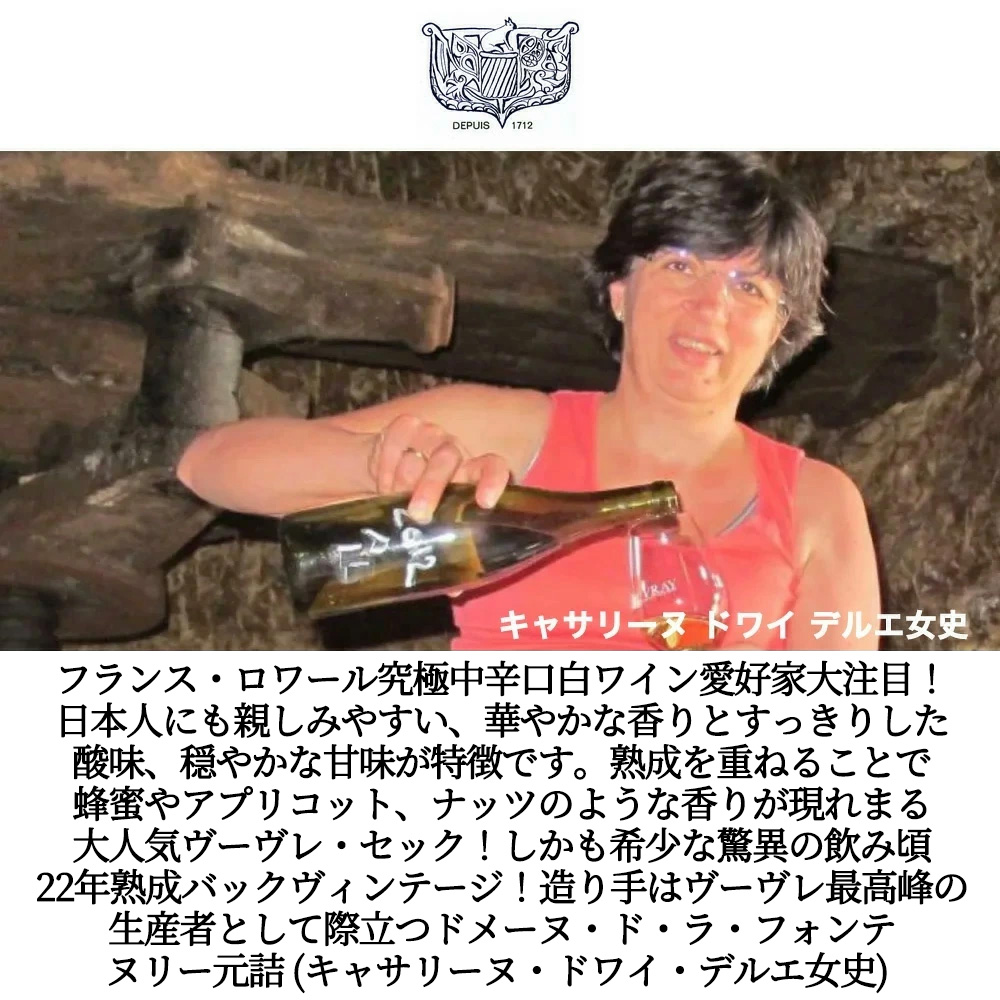 日本人にも親しみやすい、華やかな香りとすっきりした酸味、穏やかな甘味が特徴です。熟成を重ねることで蜂蜜やアプリコット、ナッツのような香りが現れます。このヴーヴレ・ドゥミ・セック[2003]年・蔵出し限定作品・ドメーヌ・ド・ラ・フォンテヌリー元詰 (キャサリーヌ・ドワイ・デルエ女史) は熟成感とミネラル感にシュナン・ブラン種100%のシャプタリゼーションなしの完熟した自然な甘味と酸のバランス!の究極ヴーヴレ・ドゥミ・セック!しかも貴重な22年熟成作品が現地のセラー数ヶ月前の蔵出し作品で少量入荷!