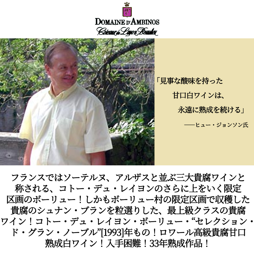 彼のこのコトー・デュ・レイヨン・ボーリュー・“セレクション・ド・グラン・ノーブル”は、EU各国、北欧諸国、アメリカ、カナダ等々、とりわけ欧米市場で高い評価を受けています。しかも市場では少なくなってきている[1993]年もの!33年熟成コトー・デュ・レイヨン・ボーリュー・“セレクション・ド・グラン・ノーブル”のオールドが、限定で少量入荷!